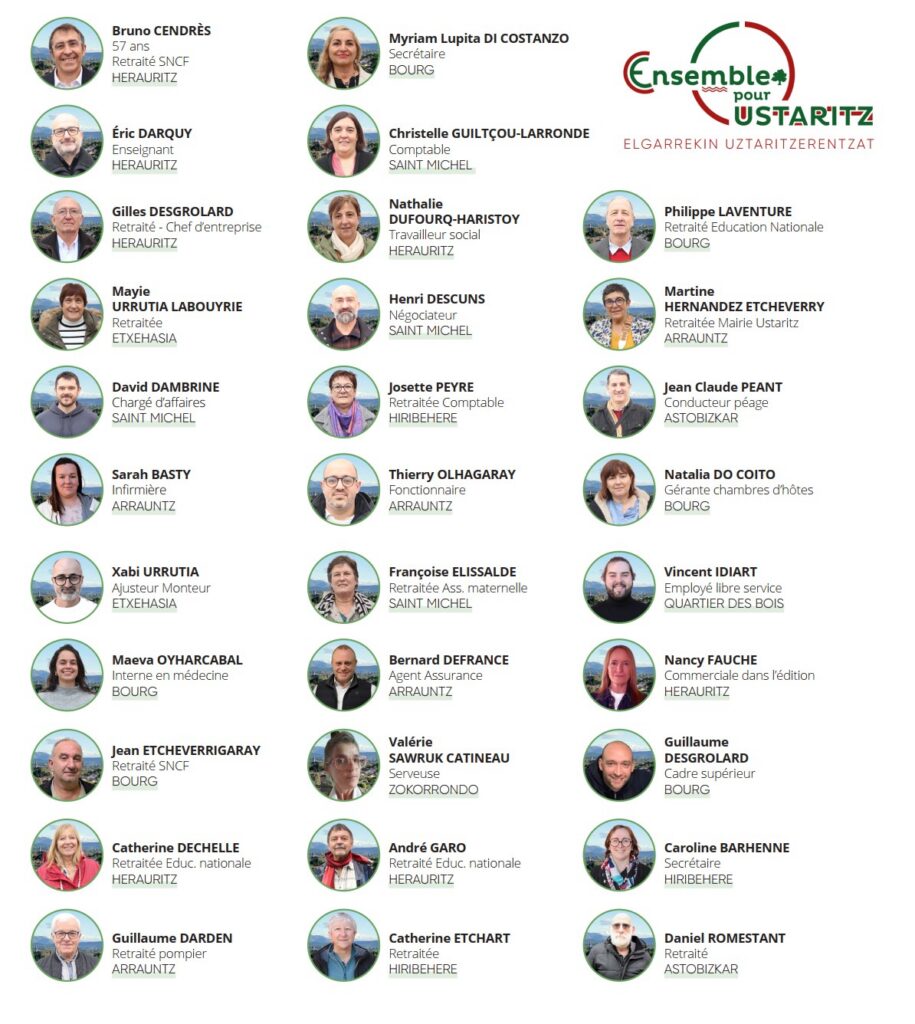 A l’issue des dernières élections municipales (2020), voici les élus de la liste « Ensemble pour Ustaritz » siégeant au conseil municipal.